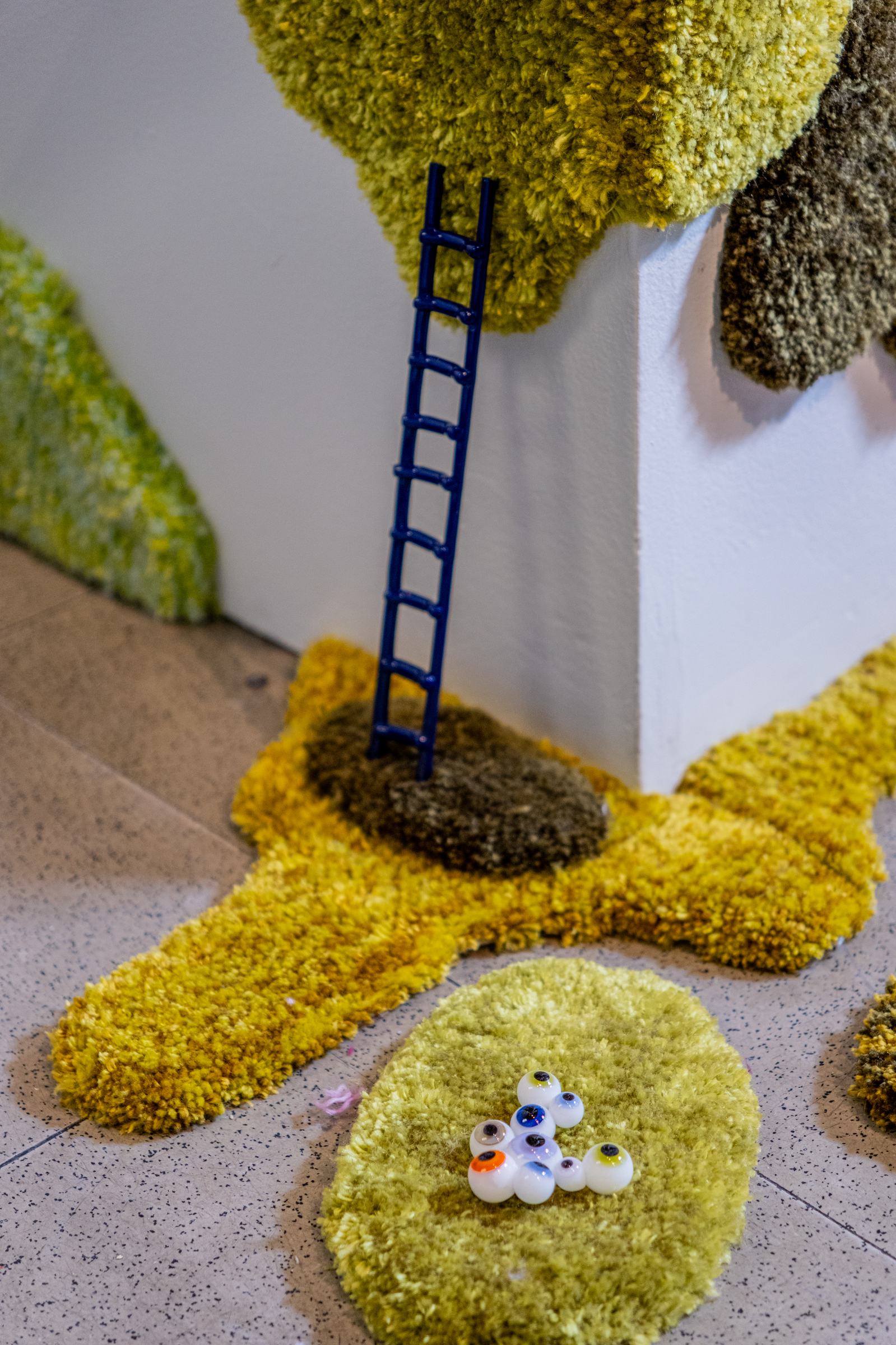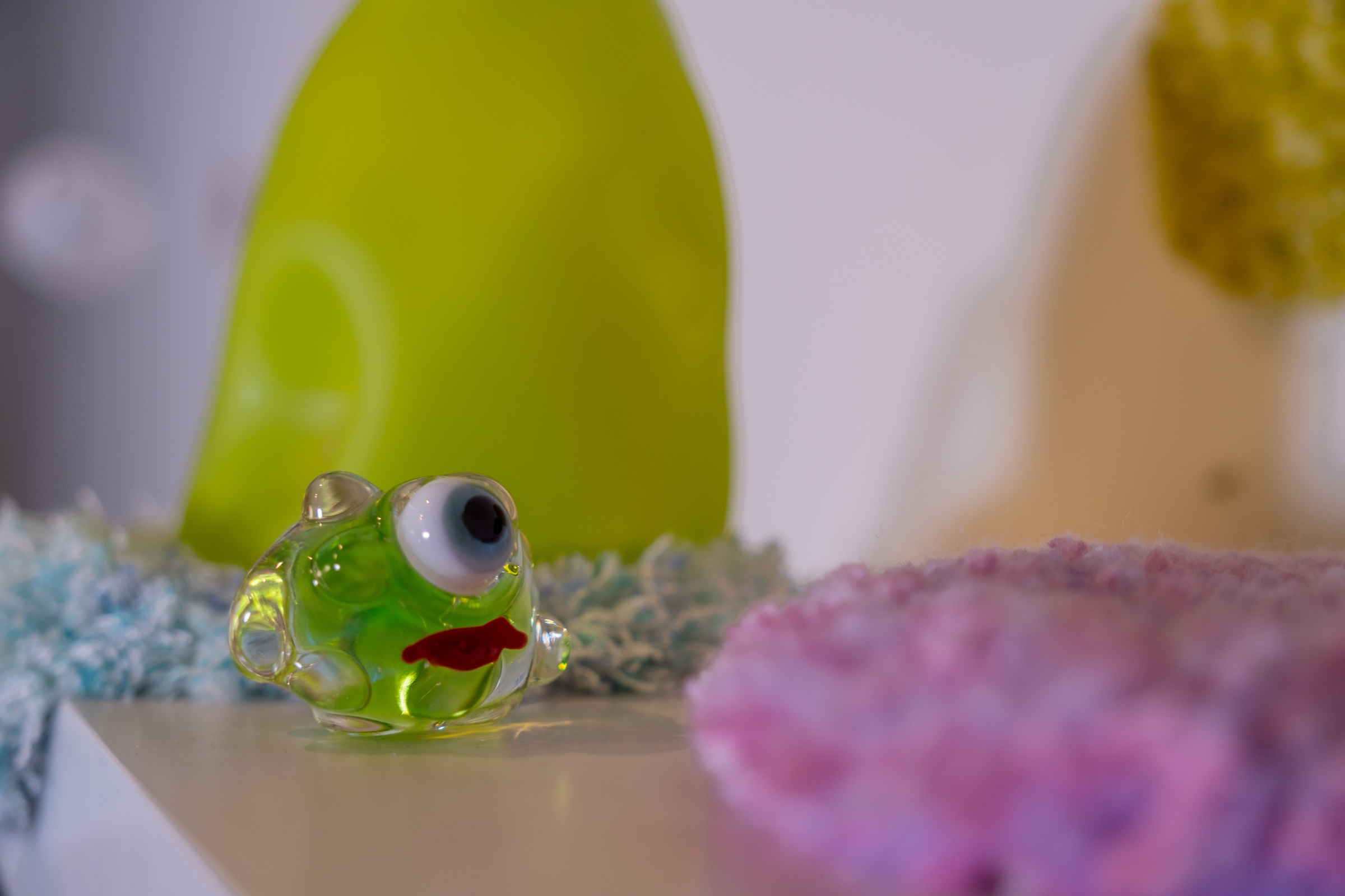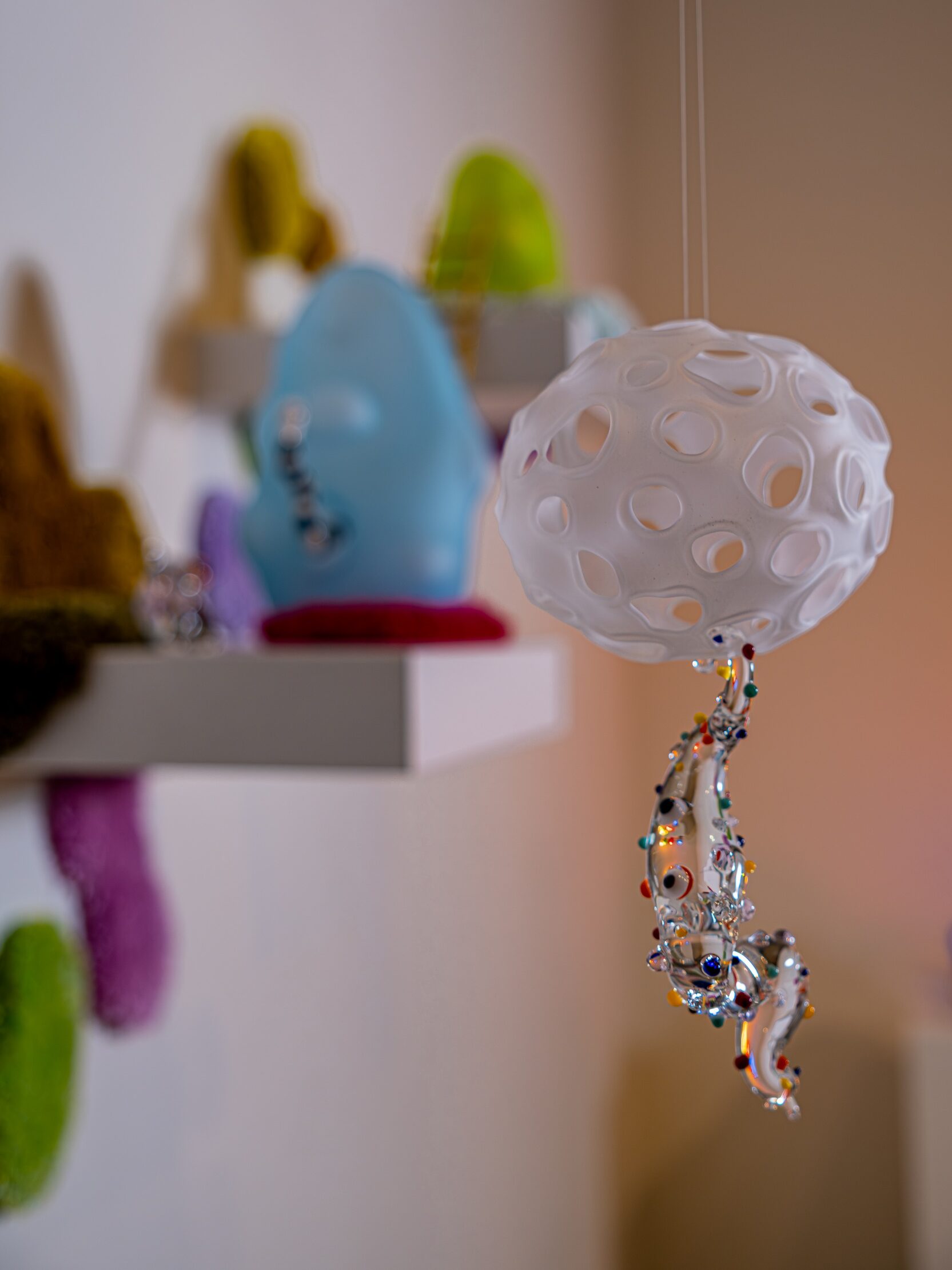 My work immerses the viewer in a miniature, imaginary universe. It comprises several elements: coloured blown-glass mountains with organic, misshapen forms, ranging from 9 cm to 20 cm in height, scattered across the floor, as well as a one-metre-tall pedestal. On the wall, near the pedestal, two floating shelves are mounted: one rectangular, the other square. Coloured tufted wool moss carpets, ranging from 10 cm to 30 cm in width, cover the floor and extend onto the pedestal as well as onto the wall shelves. Small figures of approximately 5 cm, created using a torch with coloured glass, evoking abstract microbes and insects, inhabit this space. Endowed with many details, such as bulging eyes, expressive faces, arms and legs, they offer a dynamic and lively presence. Suspended in the air like clouds, perforated spheres of approximately 10 cm in diameter float above this world. The installation, spread across the floor, creates total immersion, inviting the eye to explore this miniature universe from every angle.